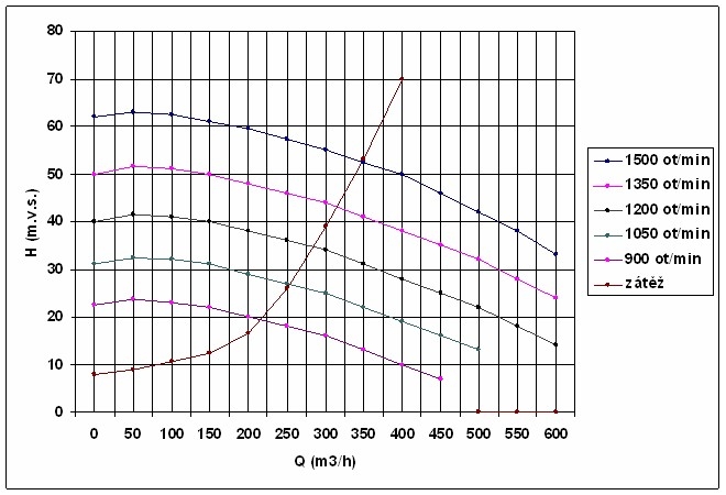 Q=400m3/h (pro jedno čerpadlo Q=200m3/h), H=59m.v.s., otáčky n=1500ot/min, účinnost 65%