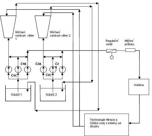 Jak je vidět z výše uvedeného technologického schématu, čerpadla Č1A a Č2A slouží pro obsluhu větve č. 1 a č. 2 míchacího centra odsíření. Čerpadla Č1B a Č2B jsou čerpadla odseparované vody, kterými se budeme zabývat. Čerpadla Č1C a Č2C slouží jako záskok při poruchách jak čerpadel ČA, tak čerpadel ČB. Odseparovaná voda, ve které jsou obsaženy částice popele a strusky, je čerpadly ČB čerpána do prostor kotelny (vždy pracují současně čerpadla Č1B i Č2B). Zde je použita pro doplnění hladiny vody ve vynašečích strusky pod jednotlivými kotli a také pro ostřiky choulostivých částí vynašečů, na které se struska nalepuje. Regulace množství dodávané odseparované vody z míchacího centra na kotelnu probíhala pomocí elektricky ovládaného regulačního ventilu na základě údaje měření průtoku. Vzhledem k tomu, že přepravovaná voda obsahuje abrazivní částice popele a strusky, bylo nutné regulační ventil několikrát ročně opravovat (vysoké náklady na údržbu). Navíc je tento způsob regulace energeticky velmi nehospodárný.