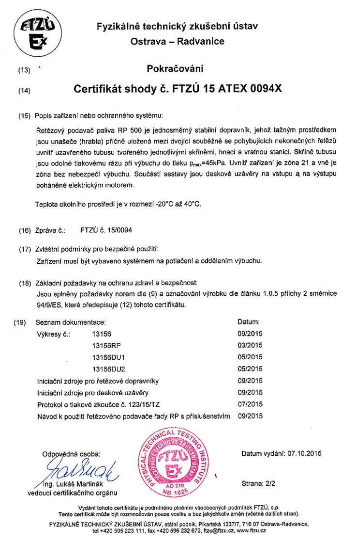 Certifikát ATEX - řetězový podavač paliva pokračování