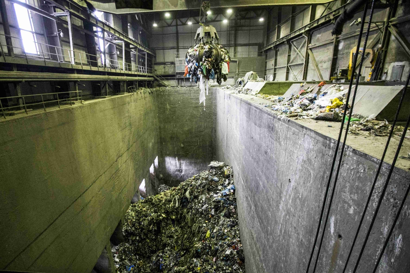 Nabírání směsného komunálního odpadu drapákem s kladnicí