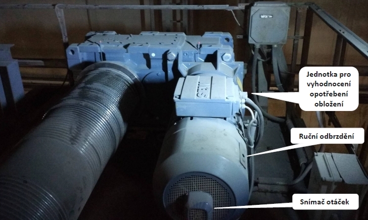 • programovatelný automat a čítač pulsů IRC pro vyhodnocení signálů z brzdné jednotky a inkrementálního snímače otáček motoru - zajišťují kontrolu aktuálního stavu brzdy a varování při dosažení limitního opotřebení a zamezení propadu břemene při poruše